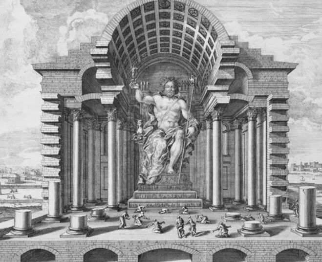 雕塑家菲迪亚斯在公元前435年左右建造,这座雕像高40英尺,描绘了希腊神宙斯坐在宝座上的形象,这座雕像在公元5世纪的被毁坏,很少有历史图像存在。